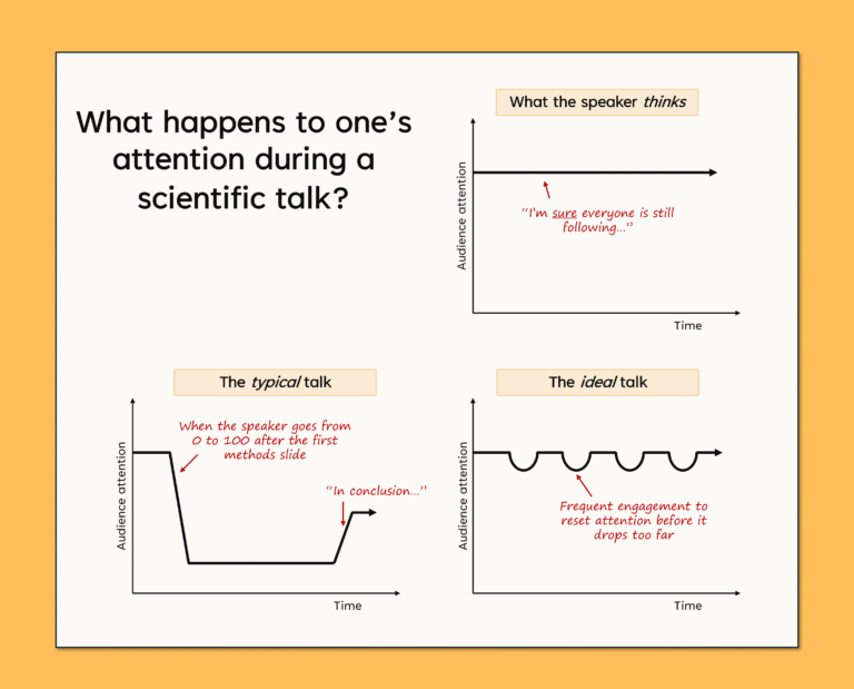 - Tell a (brief) story. Break up your facts with a change of flow by presenting information via a short story or anecdote: “We planned our experiment to reward the mice with cheddar, but it turns out they didn’t like it. So we used Swiss instead.” Framing your information this way will recapture participants’ attention much more effectively than saying “Swiss cheese was used as a reward.” Stories make information easier to process, allowing the audience to engage for a longer time with less effort.